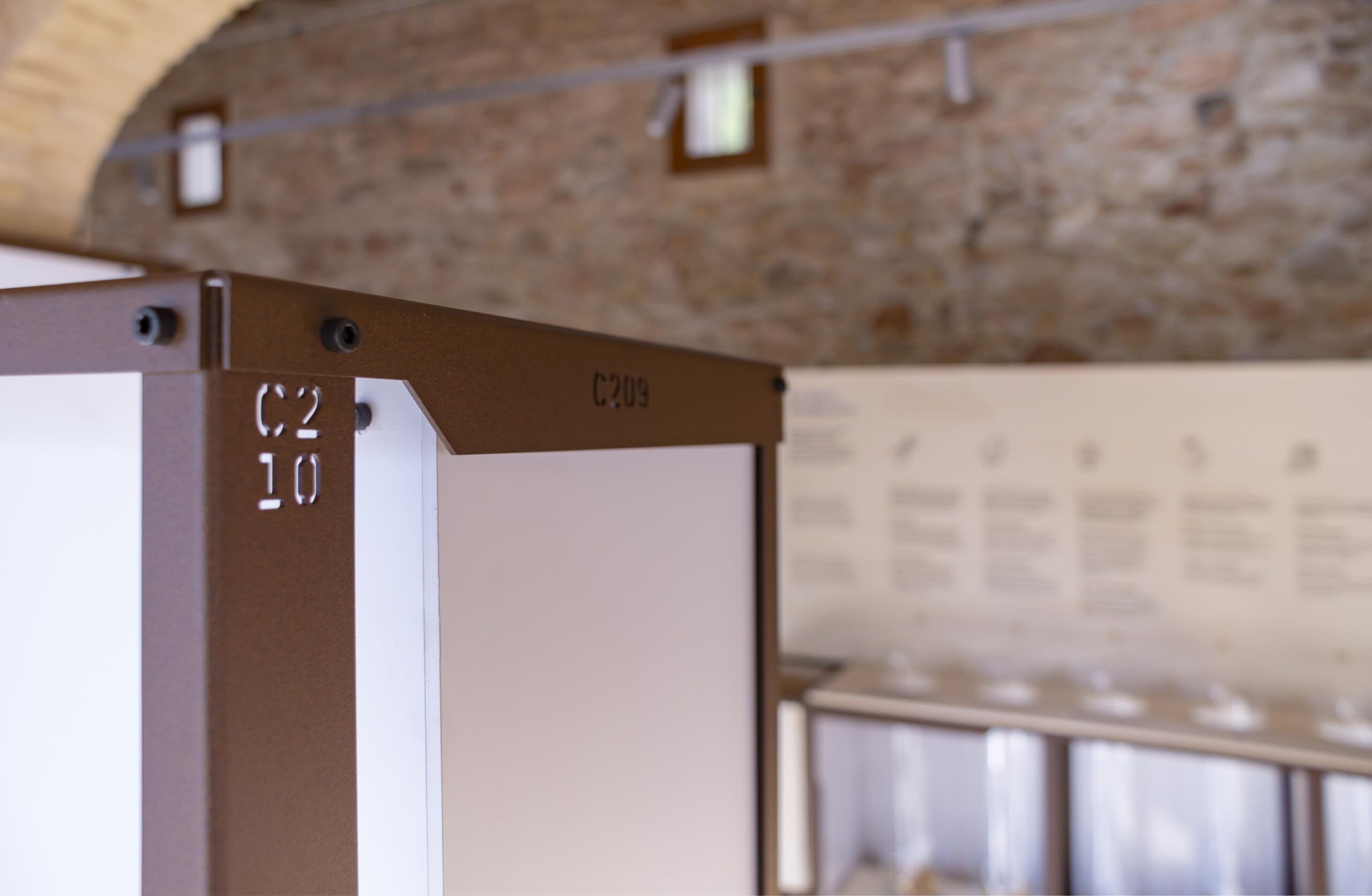 The exhibition is distributed in all spaces, where the 5 senses are appealed: touch, through a display of a vine branch; smell, through fragrant test tubes; hearing, through a sound reproduction of wooden casks treatment; sight, through suggestive images of the space and taste, through wine tasting.