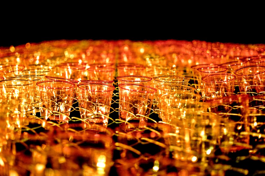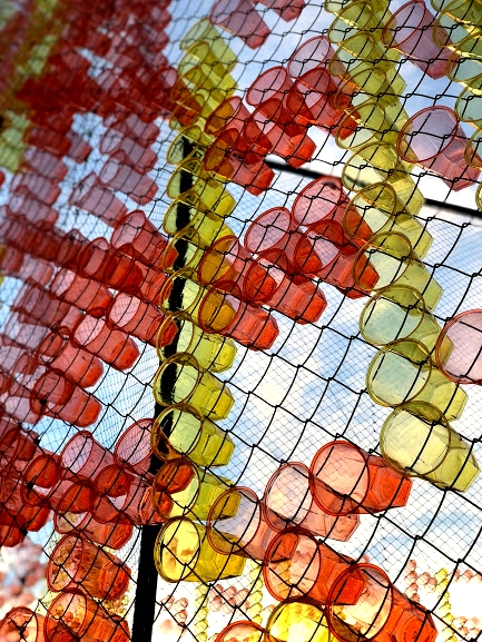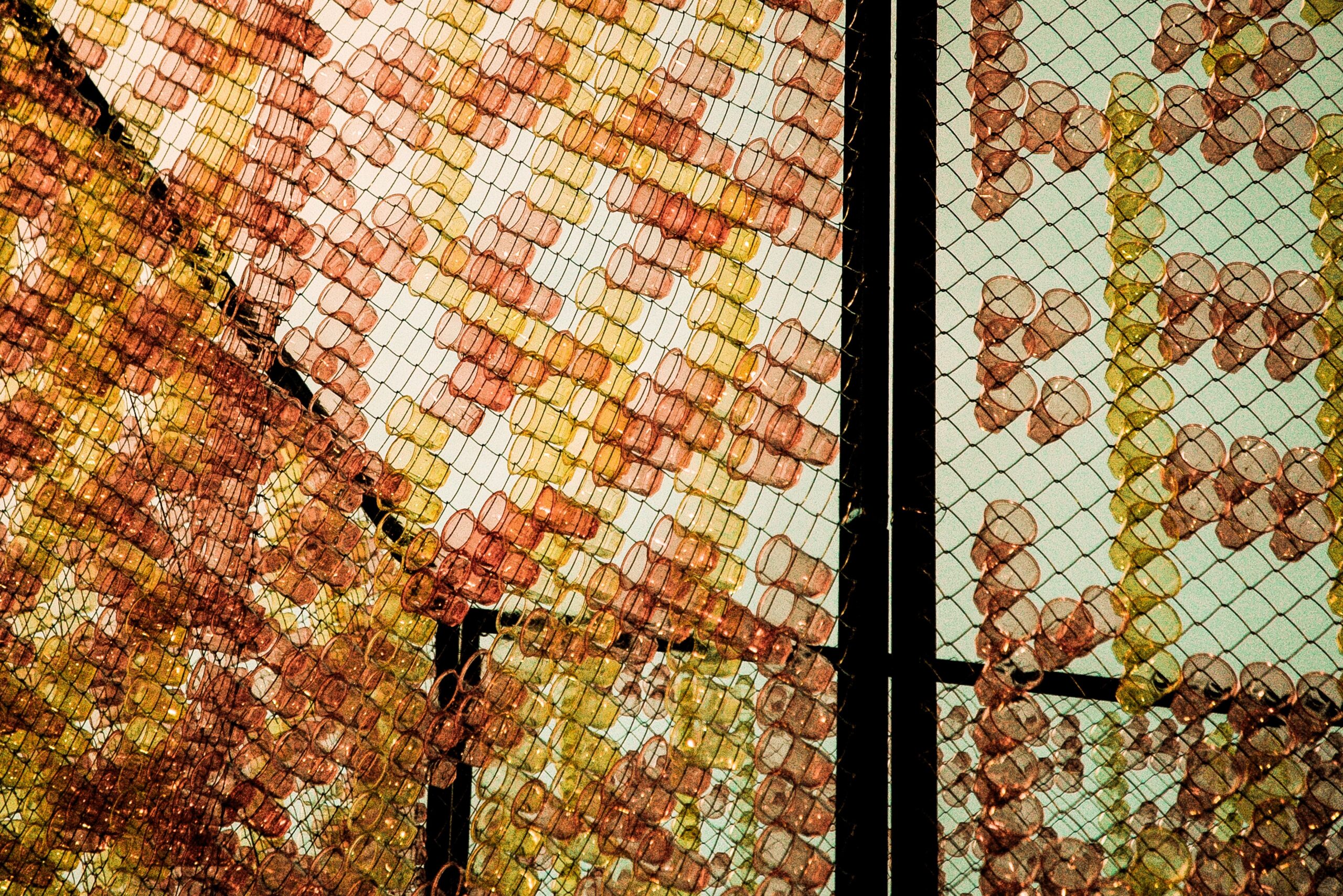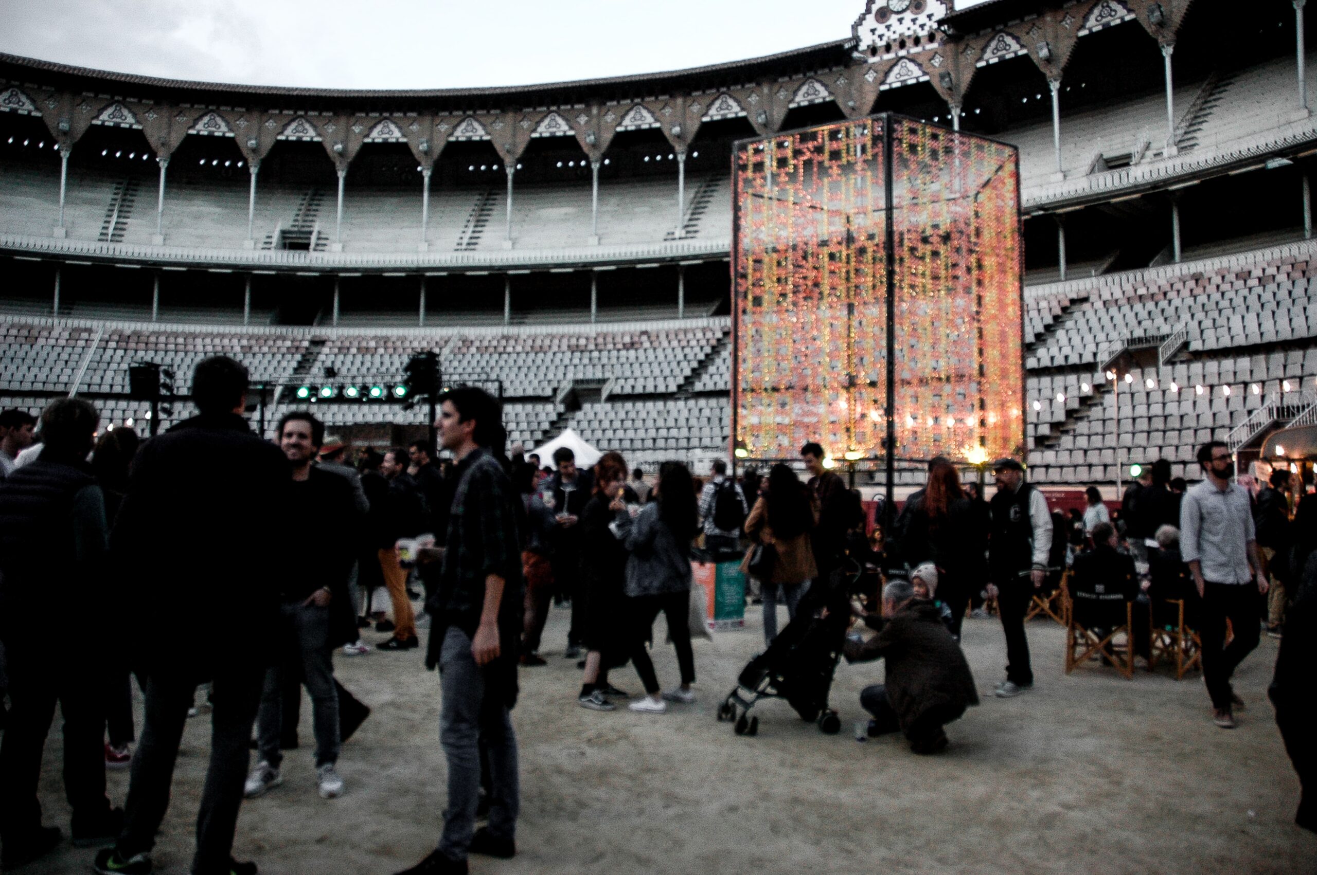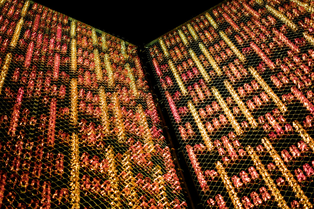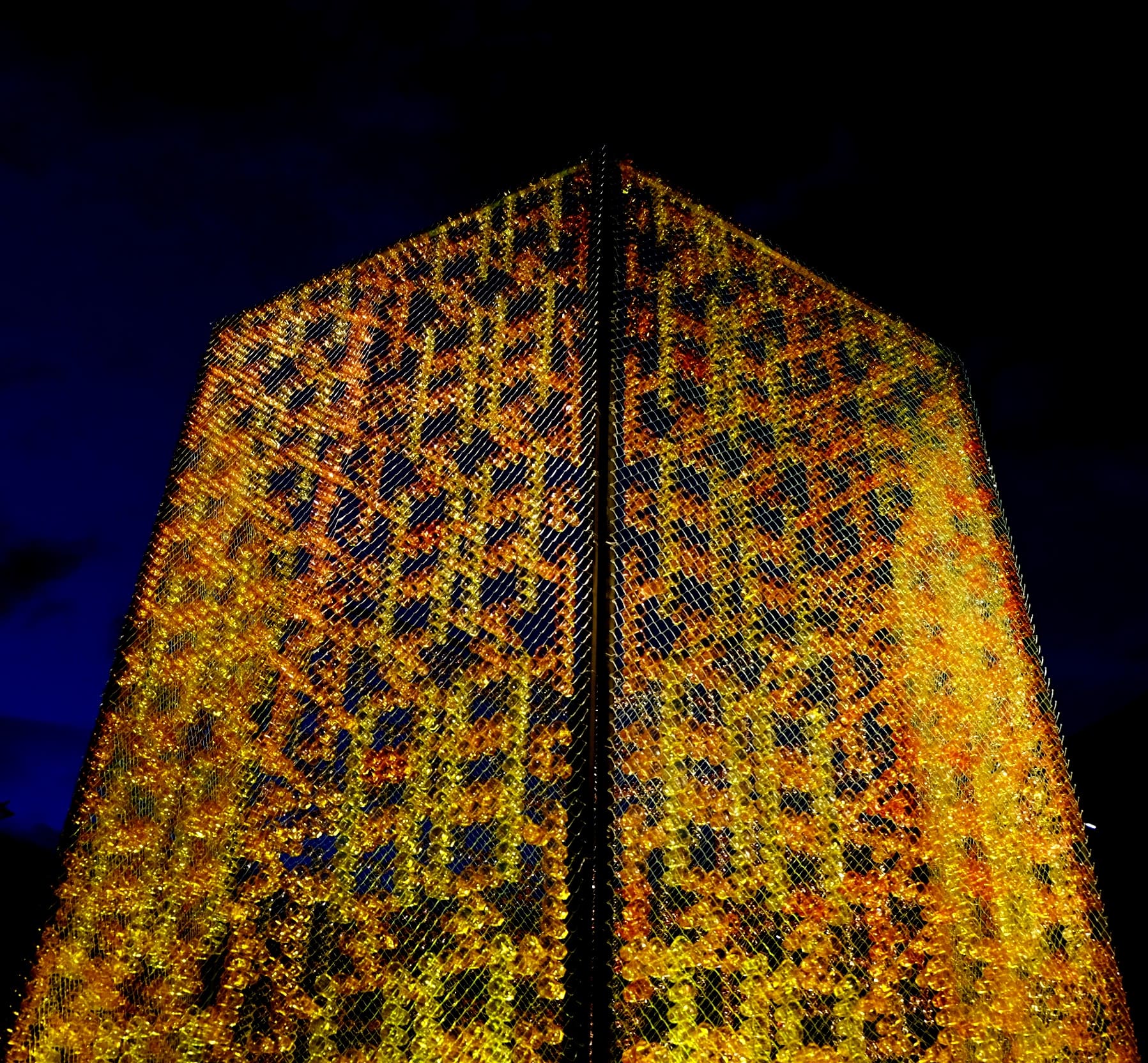 The project was conceptualized and developed taking these major constraints as design opportunities. MEATS team proposed a construction system using a metal mesh and 11.000 reused plastic glasses to create a light responsive jail, that would wrap a 6 meters tall steel structure with a hexagonal plan.